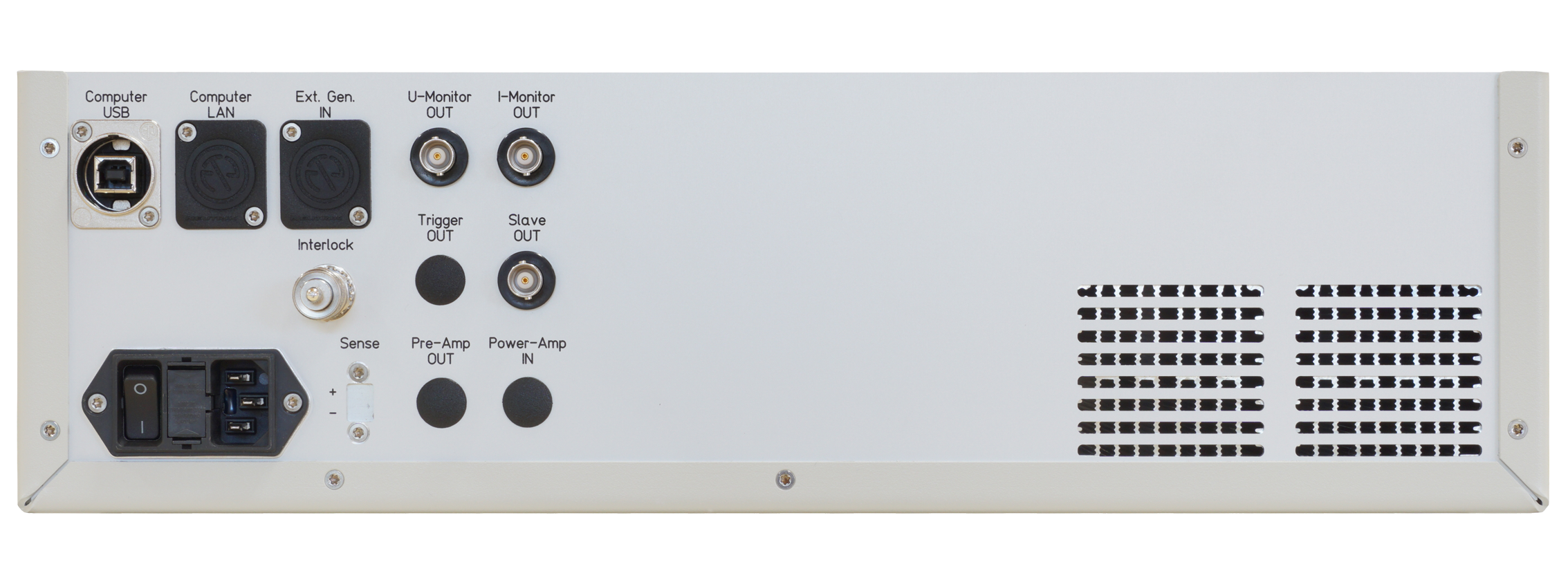Operation is performed via the control elements on the front panel of the amplifier and the graphical user interface on a PC, which is connected to the amplifier by means of the USB or LAN interface (the required software is included in the scope of delivery). If higher output voltages or higher output currents are needed, configurations with several A1110-05-E devices connected in series or in parallel are possible.