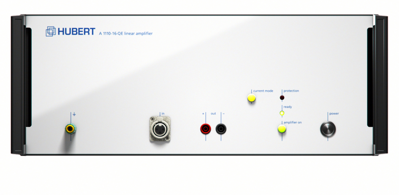The A1110-16-QE is a linear, extreme broadband precision power amplifier. It is ideally suited for applications that require fast signal processing at high power. The A1110-16-QE can be operated either as voltage amplifier or as current amplifier. In current amplifier mode it provides constant, frequency-independent output current e.g. for inductive loads.