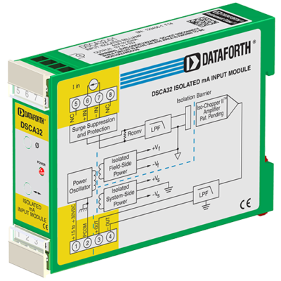 Each DSCA32 current input module provides a single channel of analog input which is filtered, isolated, amplified, and converted to a high-level voltage output. Signal filtering is accomplished with a five-pole filter which provides 85dB of normal-mode rejection at 60Hz and 80dB at 50Hz. An anti-aliasing npole is located on the field side of the isolation barrier, and the other four poles are on the system side. After the initial field-side filtering, the input signal is chopped by a proprietary chopper circuit. Isolation is provided by transformer coupling, again using a proprietary technique to suppress transmission of common mode spikes or surges.