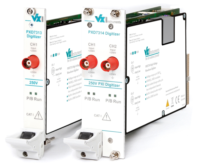 The PXD731x High Voltage Digitizer-Family features up to two 100 MS/s simultaneously sampled input channels with 16-bit resolution, input voltages up to ±250V and a bandwidth up to 50MHz. Every digitizer channel has its own 2 MB memory which allows up to 1 million samples. All PXD731x High Voltage Digitizer-Family devices have a high common mode rejection ratio (CMRR) due to the isolated digitizer inputs.